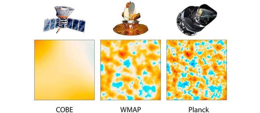Сравнение изображений реликтового излучения, полученных обсерваториями COBE, WMAP и «Планк».