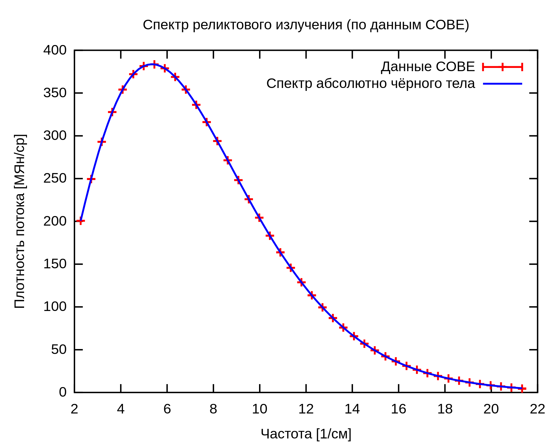 Спектр реликтового излучения по данным, полученным с помощью инструмента FIRAS на борту спутника COBE (ошибки измерений не видны в масштабе рисунка)