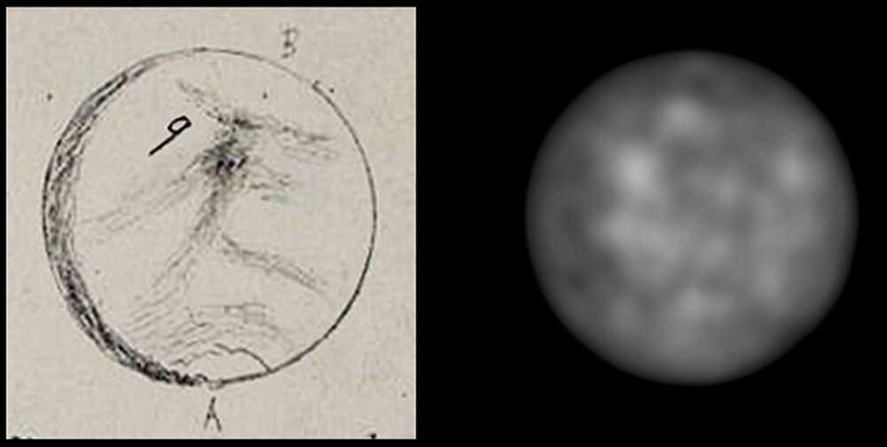 После появления телескопа удалось более детально изучить Марс. Первым это сделал Галилео Галилей. Через полвека итальянский ученый Франческо Фонтана изобразил Марс. Это случилось в 1659 году. Его эскиз обладал сферической формой и имел внутри черное пятно.