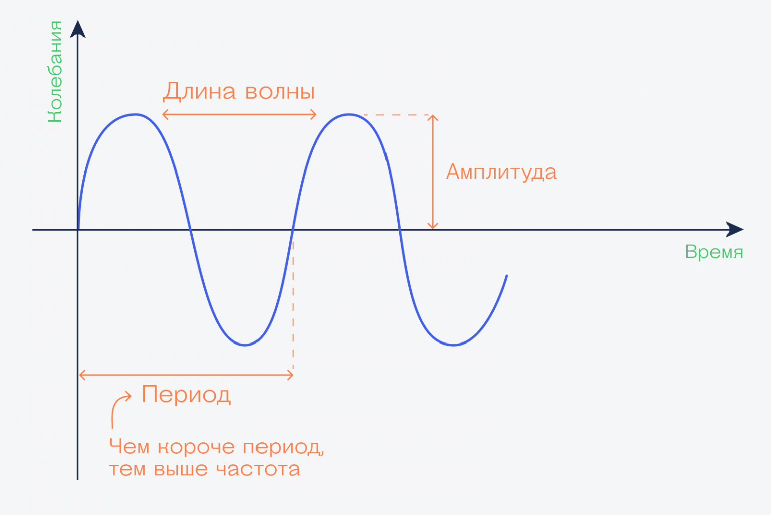 Звуковая волна — это синусоида. Расстояние между пиками (вершинами) синусоиды дает длину звуковой волны. А скорость распространения волны – это расстояние, на которое распространяется волна в единицу времени. Если разделить скорость волны на её длину, то получится частота. Частота звука — количество времени, проходящего между пиками. Чем выше частота, то есть чем чаще колебания волны и количество изгибов в ней, тем более высокий звуковой сигнал мы слышим.