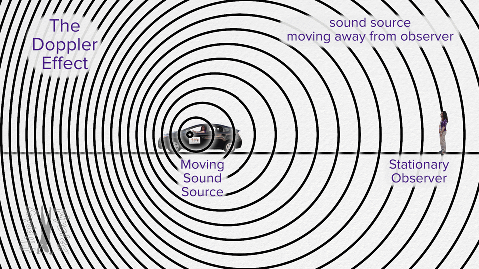 Отдаление от вас создаёт впечатление увеличения расстояния между пиками. Такое искусственное удлинение звуковой волны обманывает слух, который воспринимает звук значительно ниже.