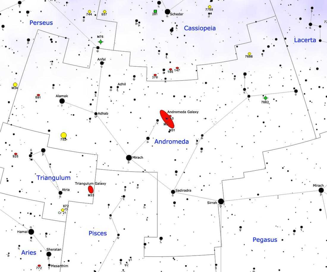 Созвездие Андромеды является также домом и для других многочисленных объектов. Оно расположено вне галактической плоскости и не содержит кластеров или туманностей Млечного Пути. Однако в нем содержатся другие видимые галактики. Одной из них как раз является галактика Андромеды.
