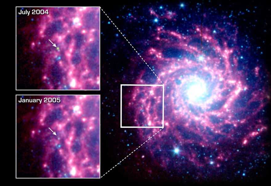 Положение сверхновой SN 2003gd в галактике Мессье 74. Сравнивая два снимка галактики, сделанные с разницей в пол года, можно заметить резкое потускнение сверхновой.