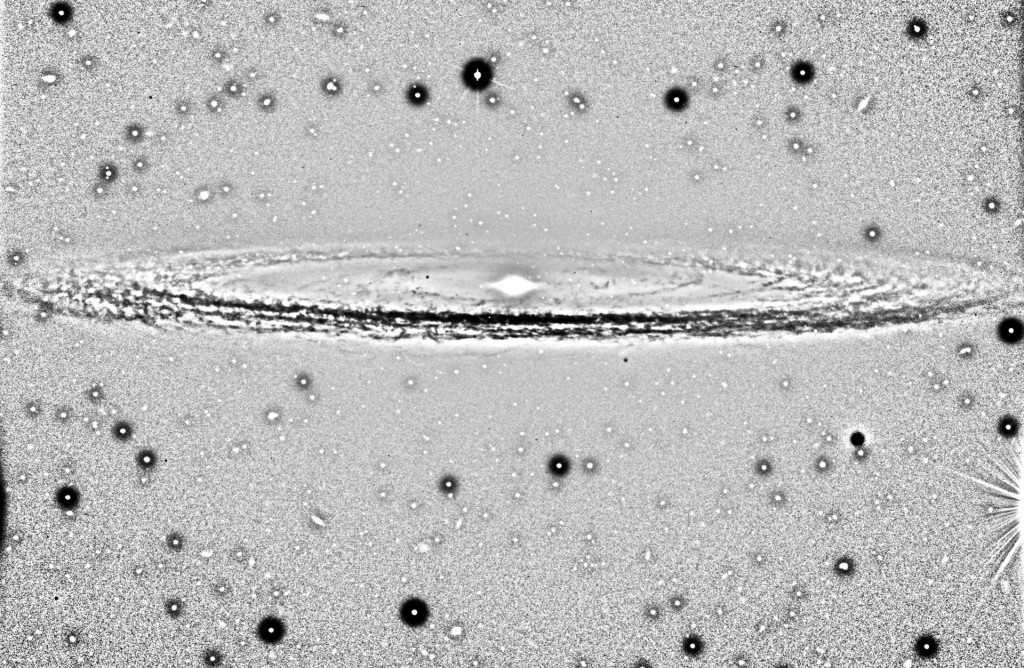 Спиральная структура галактики Сомбреро. Темные области вокруг звезд и галактик на снимке являются артефактами обработки изображения. M104 отличается выраженной ядерной выпуклостью, состоящая в основном из старых звезд.