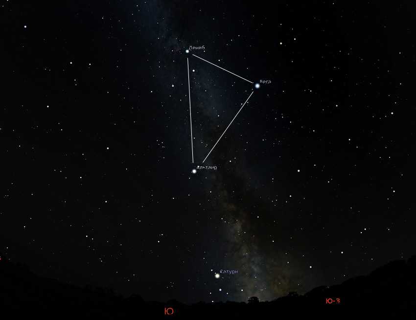 Большой Летний треугольник и Млечный Путь. Примерно так он выглядит на темном деревенском небе. Рисунок: Stellarium