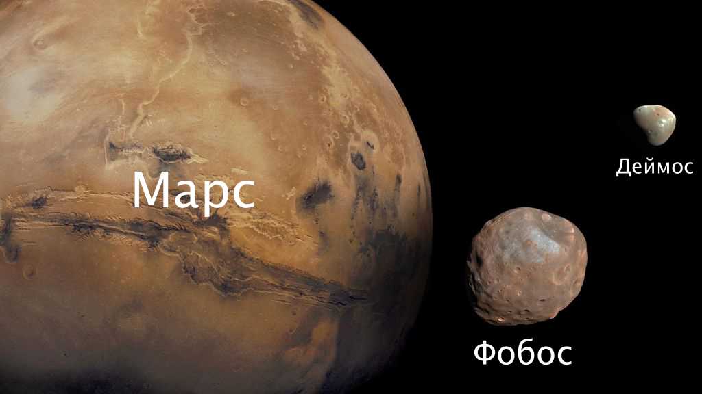 У Марса 2 спутника – Фобос и Деймос («страх и ужас» в переводе с древнегреческого). Фобос («страх») обращается вокруг планеты за 7,5 ч. Площадь его поверхности 1600 км2, а радиус – всего 11 км. Весит это небесное тело более 10 трлн. тонн. Оно всегда повернуто к планете одной стороной. Спутник вращается на удалении 6 тыс. км от Марса. Интересно, что на марсианском небе он восходит «наоборот» – на западе и заходит на востоке, а за сутки успевает 2 раза взойти и столько же раз зайти.
