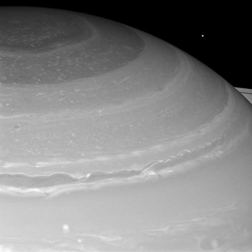 Планета и Мимас. Внизу справа расположилось кольцо А. Снимок сделан 18 марта 2013 года.
