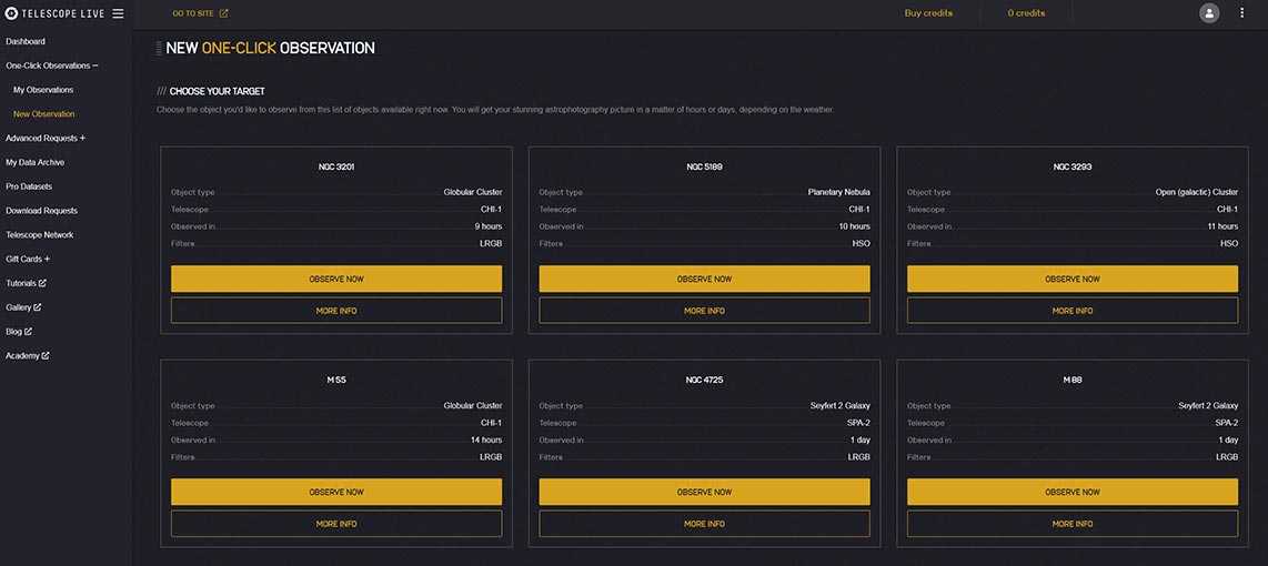 - Чтобы использовать телескоп онлайн, нажать «One Click Observation», затем «New Observation» и выбрать объекты для наблюдения;