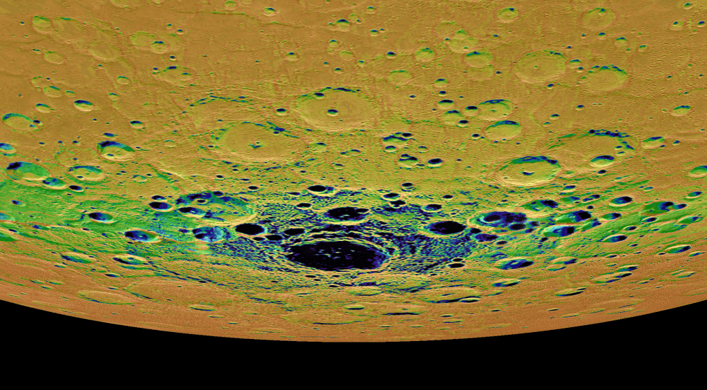 На этом снимке, сделанном «Мессенджером», показаны места расположения льда на полюсе и вблизи него.