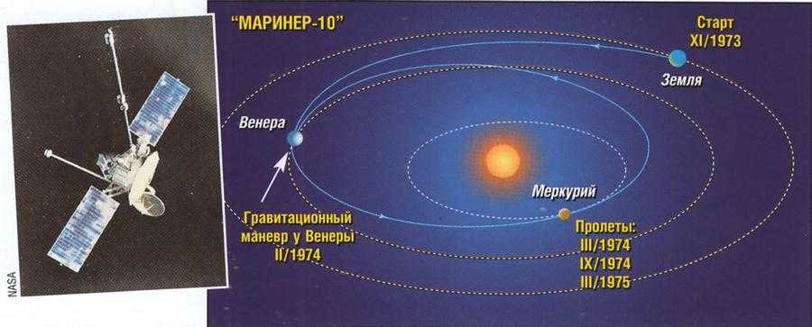 Первым около Меркурия в 1974-1975 годах трижды пролетел «Маринер-10». Он сблизился с планетой до 320 километров и сделал множество детальных фотографий, что позволило составить подробную карту почти половины Меркурия. Этот зонд передал множество ценной информации.