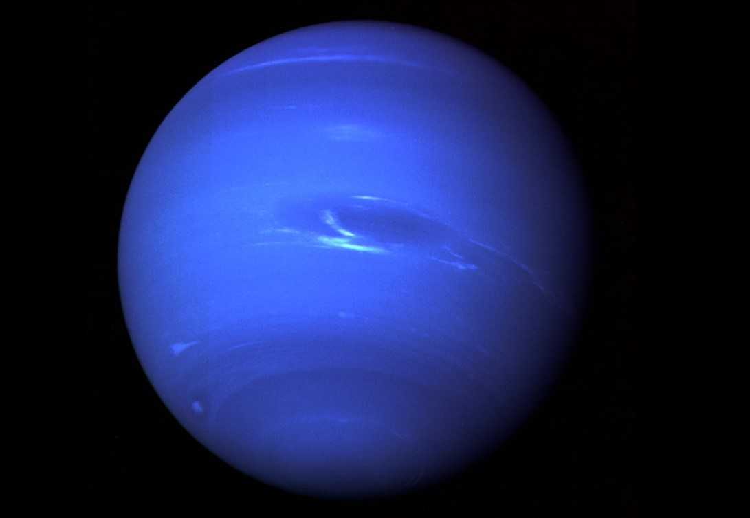 Американский зонд «Вояджер-2», когда он пролетал над Нептуном, обнаружил голубоватую планету, этот цвет обусловлен поглощением солнечного излучения метаном из верхних слоев атмосферы. Видимые узоры — это, с одной стороны, облака, а с другой — ряд структур, напоминающих наблюдаемые на Юпитере и Сатурне.