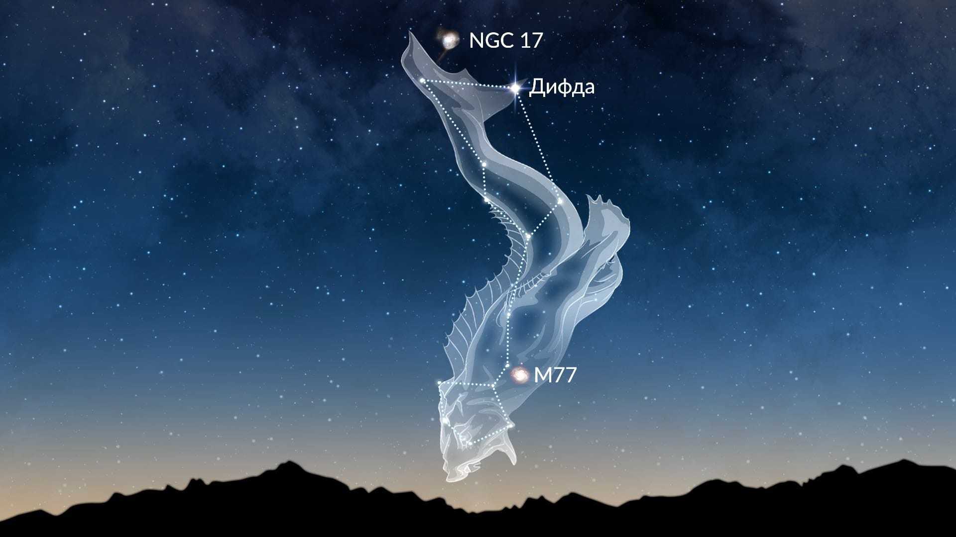 Кит – третье по величине созвездие Южного неба. Его самые яркие звезды – Дифда и Менкар. В созвездии находится более 25 галактик, которые можно увидеть в телескоп (например, NGC 17, NGC 1073, NGC 1087). Спиральную галактику M77 – единственный объект Мессье в созвездии Кита – также можно наблюдать в бинокль.