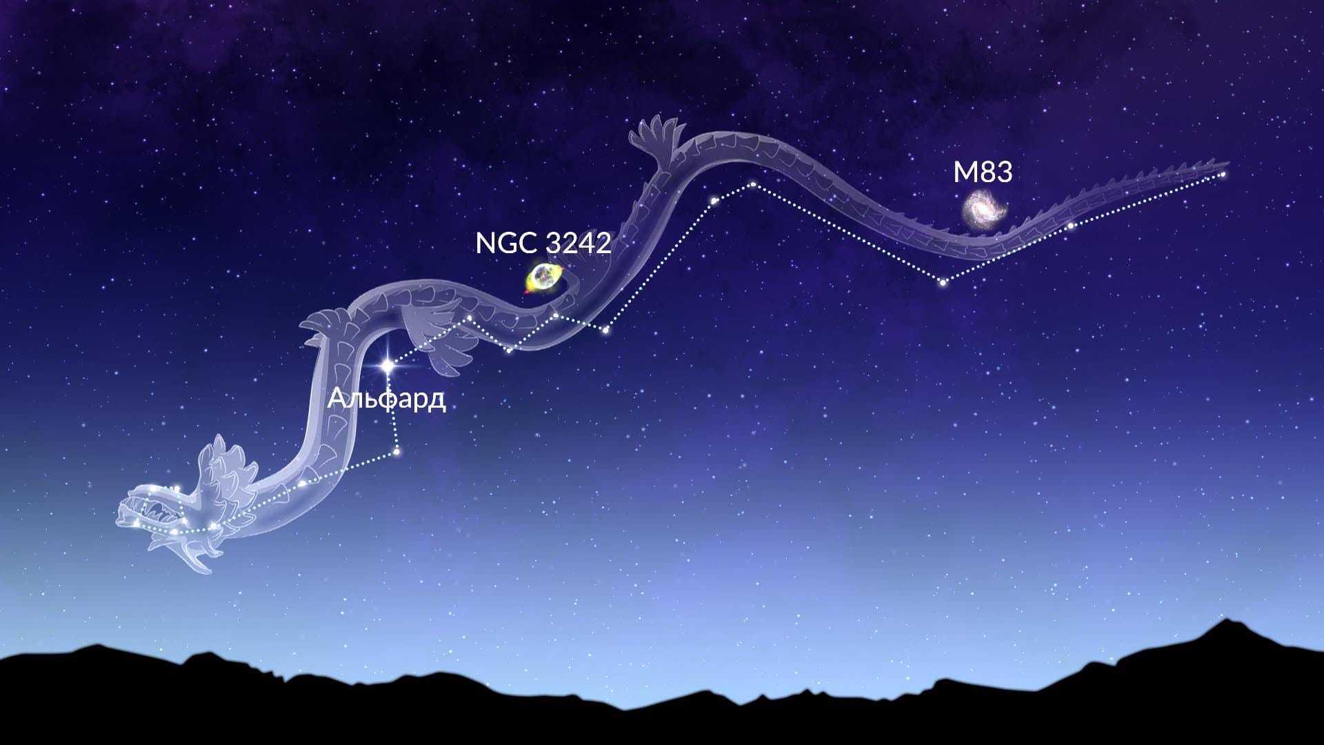 Гидра – самое большое из всех созвездий. Несмотря на размер, в Гидре не так много ярких звезд. Самая яркая из них, Альфард, обозначает “сердце” небесной змеи. Наблюдатели с орлиным зрением могут попробовать найти голову Гидры – круг из звезд, расположенный между Регулом из созвездия Льва и Проционом из созвездия Малого Пса. Оптические приборы позволят разглядеть туманность Призрак Юпитера (NGC 3242), а также три объекта Мессье – звездные скопления М48 и М68 и галактику Южное Цевочное Колесо (М83).