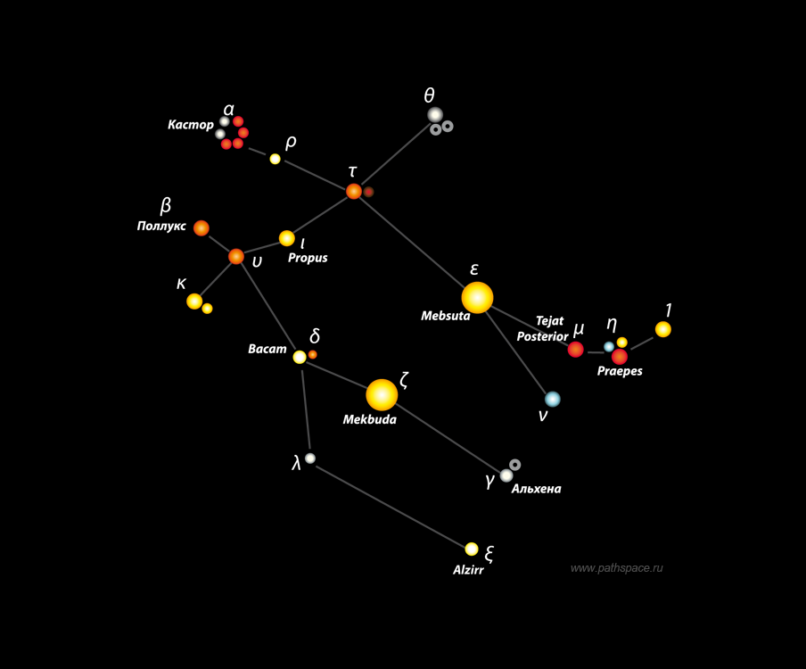 Право слово, имя созвездия не случайно! Парность в нем присуща не только «лидерам». Вот, к примеру, Мебсута и Мехбуда — две звезды «визави», одна — на уровне колен Кастора, вторая — Поллукса. Названия их почему-то связаны с лапами царя зверей, льва, из которых Мебуста — вытянутая, а Мехбуда — прижатая.