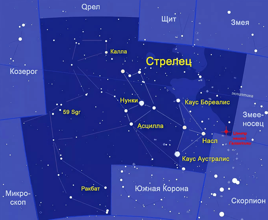 Созвездие Стрелец включает в себя около 200 неярких звезд и несколько интересных объектов. Главная звезда созвездия носит название Ракбат. Это не самая яркая звезда в Стрельце. Наименование происходит от арабского «Ар-Ракба» и означает «колено», что указывает на положение объекта в теле лучника. Он также известен как Алрами.