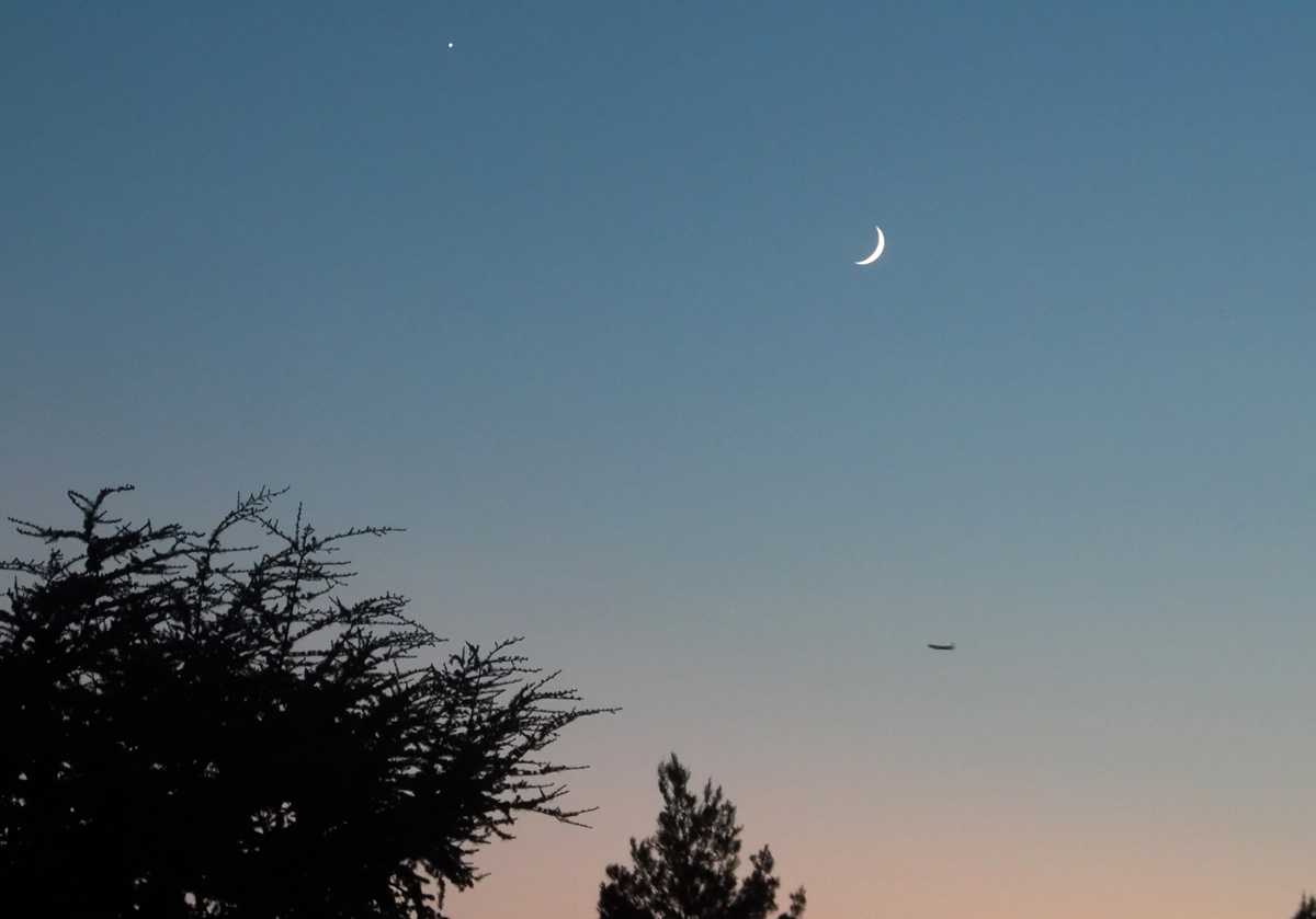 Серп молодого месяца действительно появляется низко над горизонтом сразу после захода Солнца, но на западе, а не на востоке.