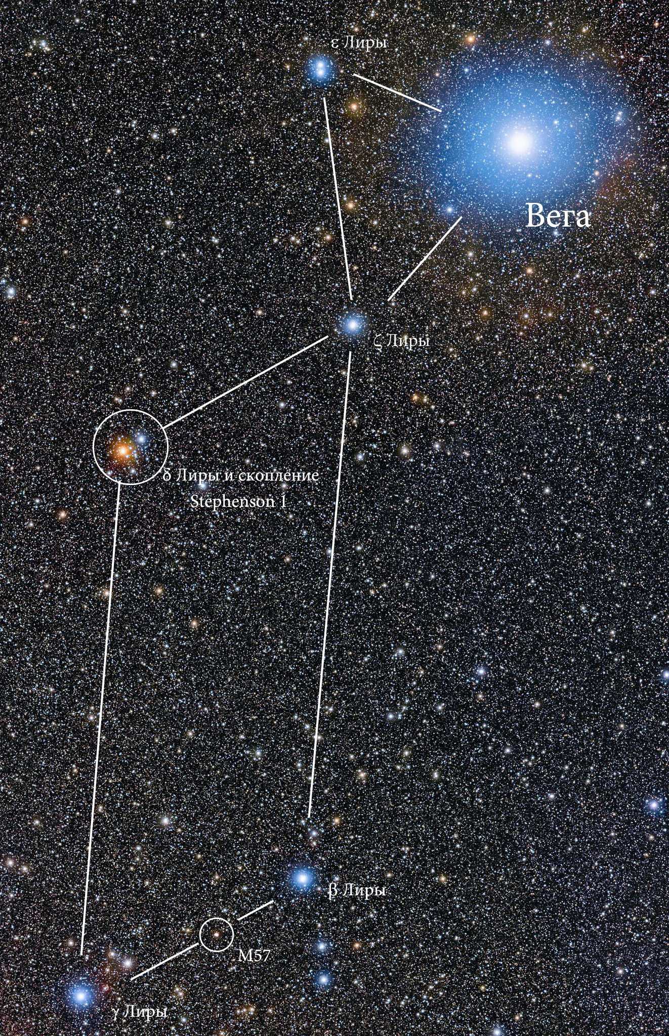 Главный рисунок созвездия Лиры сам по себе является кладезем небесных объектов. Во-первых, каждая из звезд стоит того, чтобы как минимум взглянуть на нее в телескоп. Во-вторых, здесь же находится одно рассеянное скопление и планетарная туманность М57.