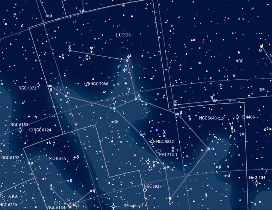 Созвездие Волка находится на краю сильно затемненного участка южного Млечного Пути , между Центавром и Скорпионом ; это означает, что в ее пределах находятся галактические объекты, однако, в общем, относительно слабые.