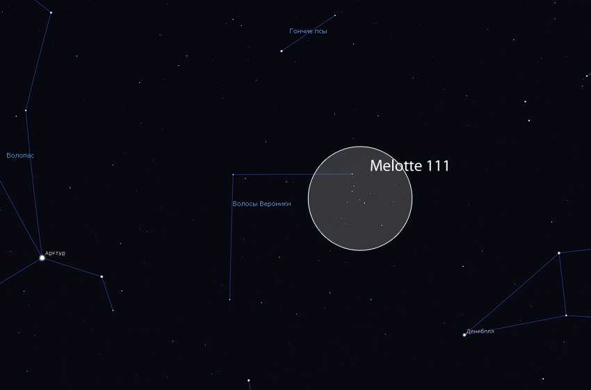 В правой части созвездия на темном небе глаз улавливает скопление звезд, похожее на «косяк» журавлей. Называется он Мелотт 111 или просто звездное скопление Волос Вероники. Рисунок: Stellarium