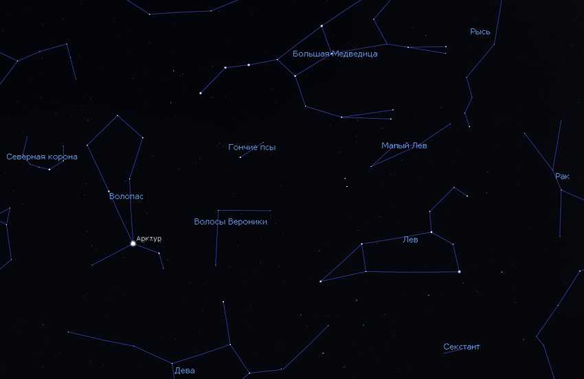 Созвездие Волосы Вероники и звезда альфа находятся между яркой звездой Арктур и Денеболой, нижней левой звездой Трапеции Льва. Рисунок: Stellarium