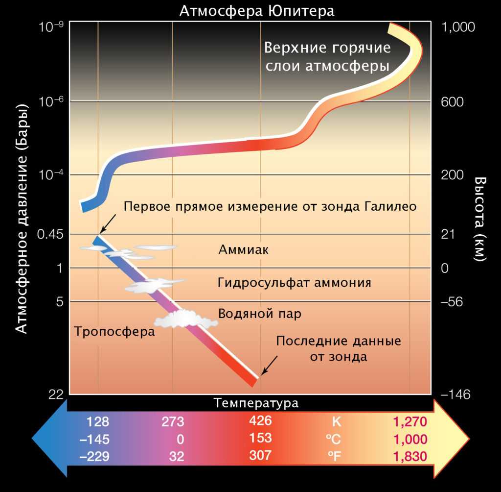 Тропосфера имеет толщину около 50 км. Водяной пар, гидросульфит аммония и аммиак образуют в ней белые и красные линии. В белых зонах газ поднимается, а в красных – опускается. Эти области могут разделяться потоками ветра. В верхних слоях тропосферы температура достигает –160° по Цельсию.