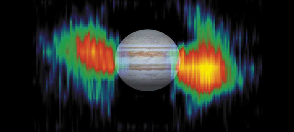 Изображение радиационных поясов Юпитера, полученное, американским орбитальным аппаратом Кассини в январе 2001 года во время его пролета над планетой. Наложенное телескопическое изображение в масштабе показывает размер и ориентацию поясов относительно планеты. Цветовая кодировка указывает силу излучения, при этом желтый и красный цвета являются наиболее интенсивными.