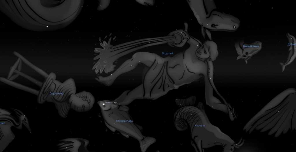 Если за окном стоит безлунная и ясная ночь, то наблюдателю без проблем удастся увидеть приблизительно 90 звезд из созвездия Водолея. При этом стоит отметить, что только семь из этих девяноста имеют звездную величину выше четырех. Данные звезды образуют своего рода изогнутую дугу, в середине которой сосредоточены пять ярчайших звезд. Эта пятерка формирует некий прообраз кувшина с истекающей из него струей воды. В данном расположении звезд непросто увидеть молодого парня с кувшином воды, но именно так и изображалось созвездие Аквариуса на античных звездных атласах.