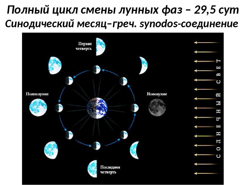 Земля также совершает обороты вокруг Солнца, а Луна вращается вокруг Земли за 29.53 дней. Это синодический период, который подвергается фазам.