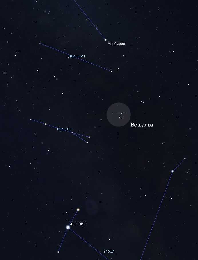 Единственный телескопический астеризм в этом небольшом обзоре — Вешалка из созвездия Лисички. Располагаясь южнее звезды Альбирео из созвездия Лебедя и справа от маленького созвездия Стрелы, эта компактная группа выглядит просто потрясающе при наблюдении в бинокль или небольшой телескоп при малом увеличении.
