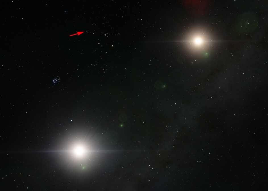 Если бы мы находились вблизи главных звёзд Альфы Центавра, то Проксима выглядела бы тусклой звездой (красноватая звезда указана стрелкой).