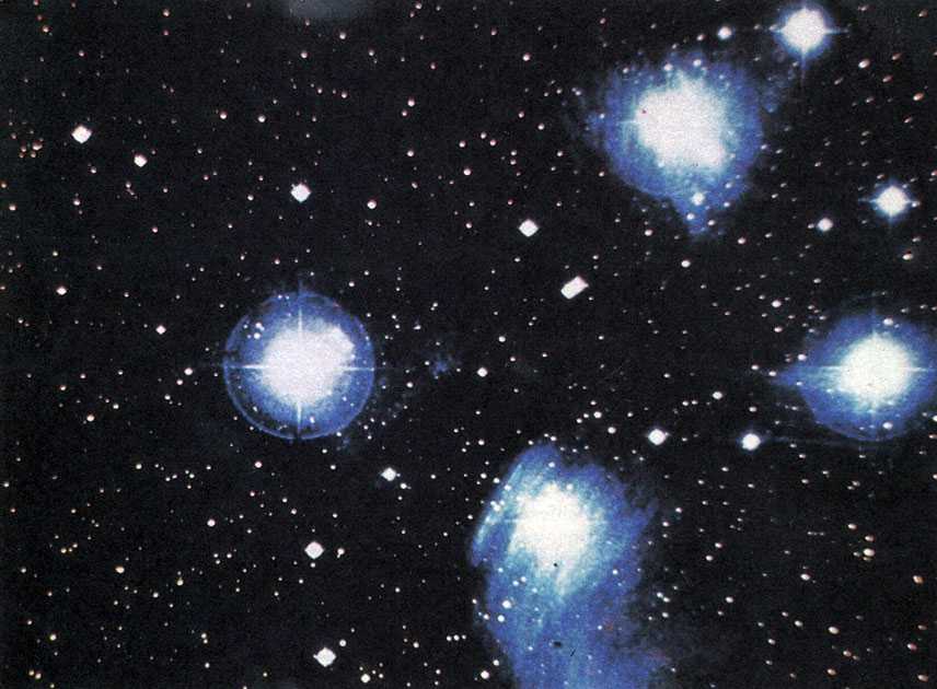 Одна из таких групп — уже встретившиеся нам в главе I Плеяды (см. рис. 14). Это исключительно красивое и легко доступное для наблюдений рассеянное звездное скопление находится от нас на расстоянии, равному 130 парсек (пс). Суммарный блеск всех входящих в него звезд равен блеску звезды 1,4 звездной величины.