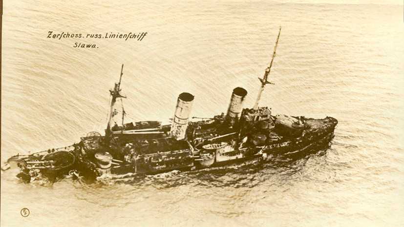 - Лежащий на грунте взорванный линейный корабль Слава, Моонзундский канал, конец 1917 года.