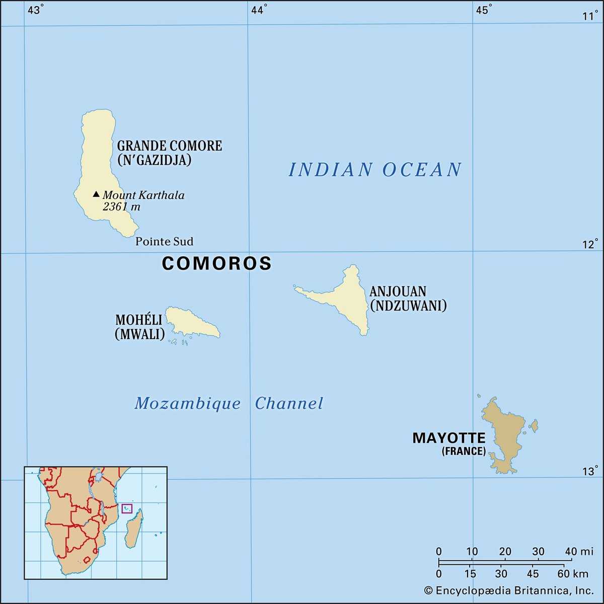 Расположено в Индийском океане в северной части Мозамбикского пролива между северным Мадагаскаром и северным Мозамбиком. Государство расположено на вулканическом архипелаге Коморских островов, включающем четыре главных острова. Острова Нгазиджа, Ндзуани и Мвали фактически составляют Союз Коморских Островов, а остров Маоре фактически имеет статус «заморского региона» Франции, но на него претендует Союз Коморских Островов.