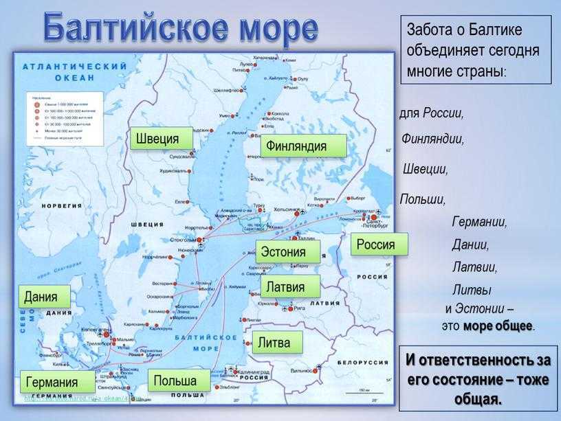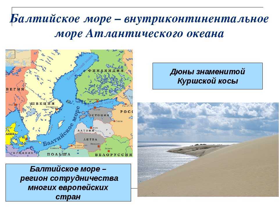 Балтийское море — это внутреннее море в Евразии, расположенное в Северной Европе и частично омывающее побережья Западной и Восточной Европы. Он является частью бассейна Атлантического океана. Балтийское море — это внутреннее море, отделенное от моря Скандинавским полуостровом и омывающее берега российских областей Ленинградской и Калининградской. Море соединено с океаном узкими и мелководными проливами, что затрудняет водообмен. Для полного восполнения запасов воды требуется 20-40 лет. Балтийское море имеет большие заливы: Ботнический залив, Финский залив, Рижский залив и Куршский залив. Площадь Балтийского моря составляет 419 000 км 2, что почти столько же, сколько площадь Черного моря (422 000 км 2 ). Протяженность береговой линии Балтийского моря составляет 7 000 км. Россия имеет около 500 км береговой линии, т.е. около 7 %. Объем воды составляет 21,5 тыс. км;