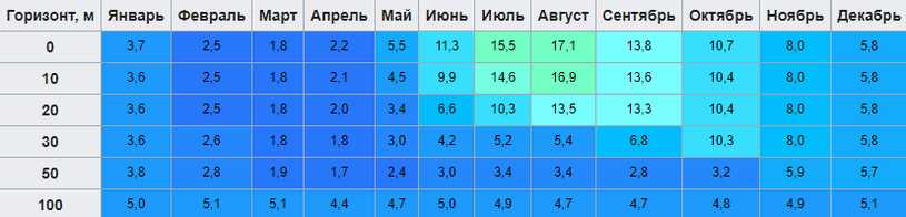 Средняя температура воды зависит от географической точки и расстояния от прибрежных мелководий, Подробно об этом мы говорили в отдельной статье, поэтому здесь коротко и самое основное. Например, в центре Финского залива средняя температура воды в августе около 16 градусов. Тогда как в прибрежных зонах она выше на 2-4 градуса. В Балтийском море можно купаться, хотя даже летом температуру его воды с температурой воды в более южных морях сравнить нельзя. Многое зависит и от конкретного лета, в частности от проникновения масс теплого воздуха со стороны Средиземного моря, о чем мы писали выше. В такие периоды температура воды у поверхности может достигать +22+23 градусов. Ниже в таблице вы можете посмотреть на температуру воды по горизонтам в центральной части Балтийского моря.