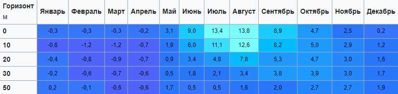 Впрочем, сегодня эти названия используются достаточно редко и только местными жителями. Ниже на таблице мы можете увидеть среднюю температуру воды по горизонтам.