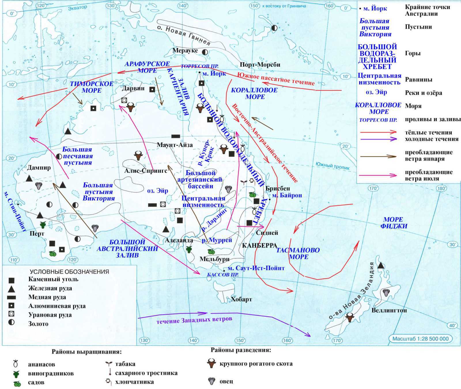 - Тёплые течения (обозначены красными стрелками): Южное пассатное течение, Восточно-Австралийское течение.