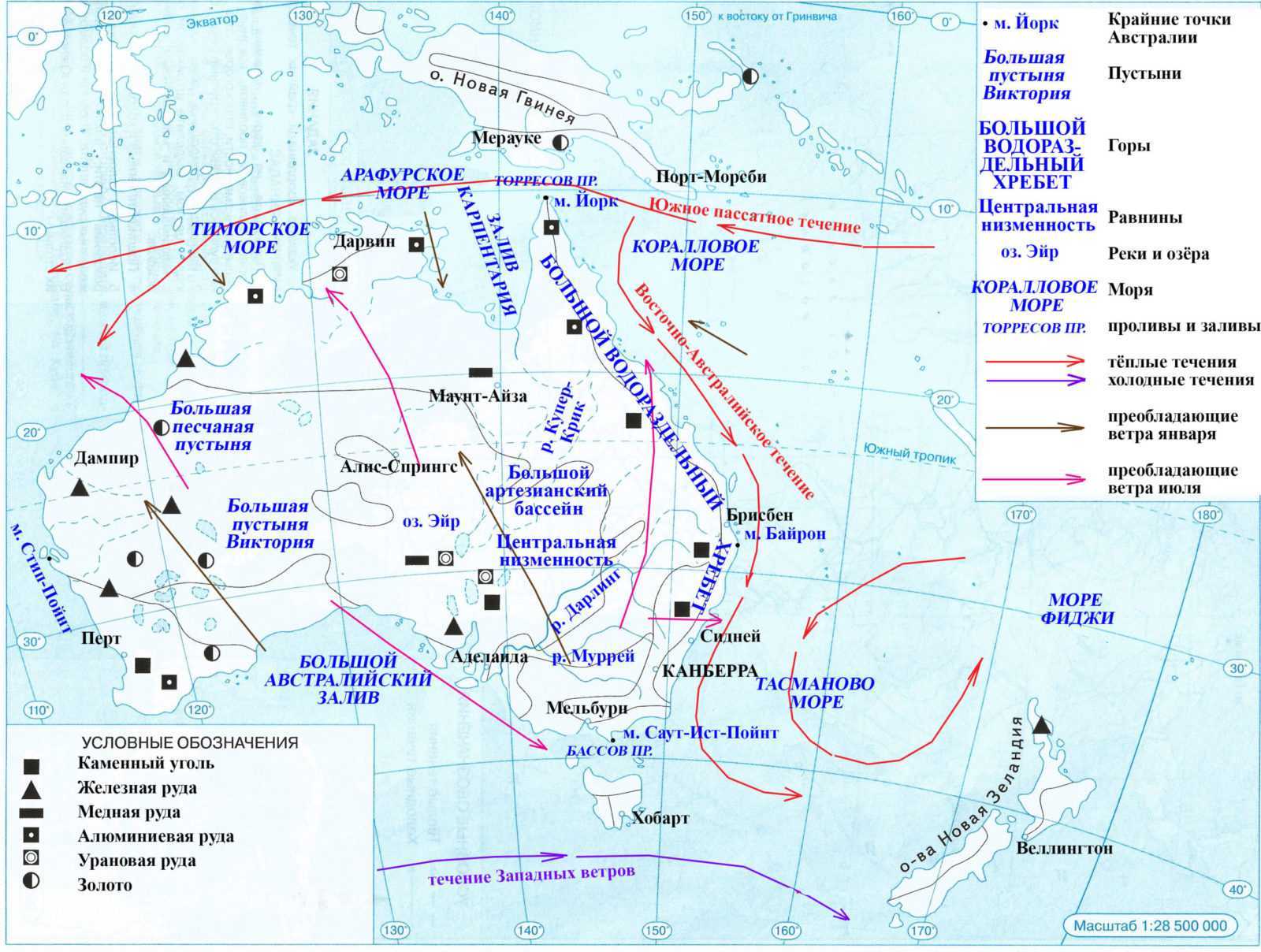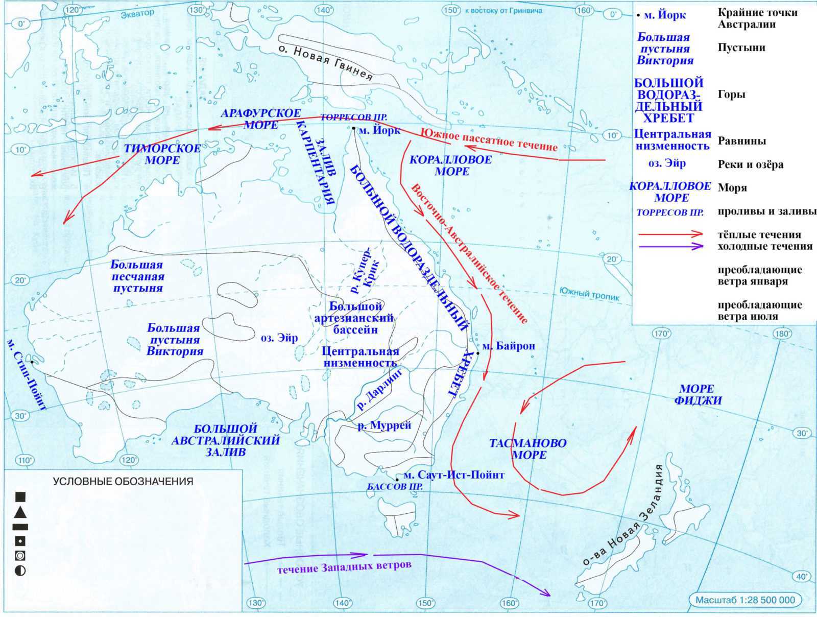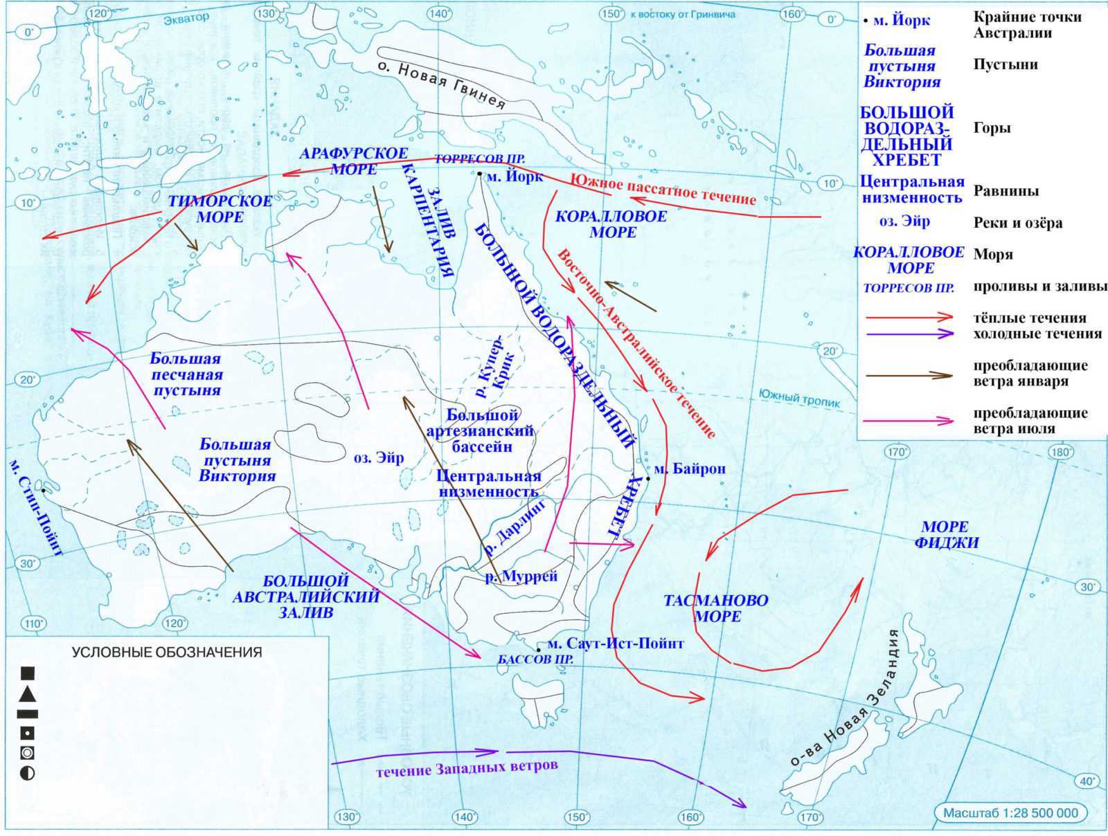 3. Подпишите моря, заливы, проливы вдоль береговой линии Австралии и Новой Зеландии. Покажите стрелками направления течений, указав цветом холодные и тёплые, а также преобладающее направление ветров.