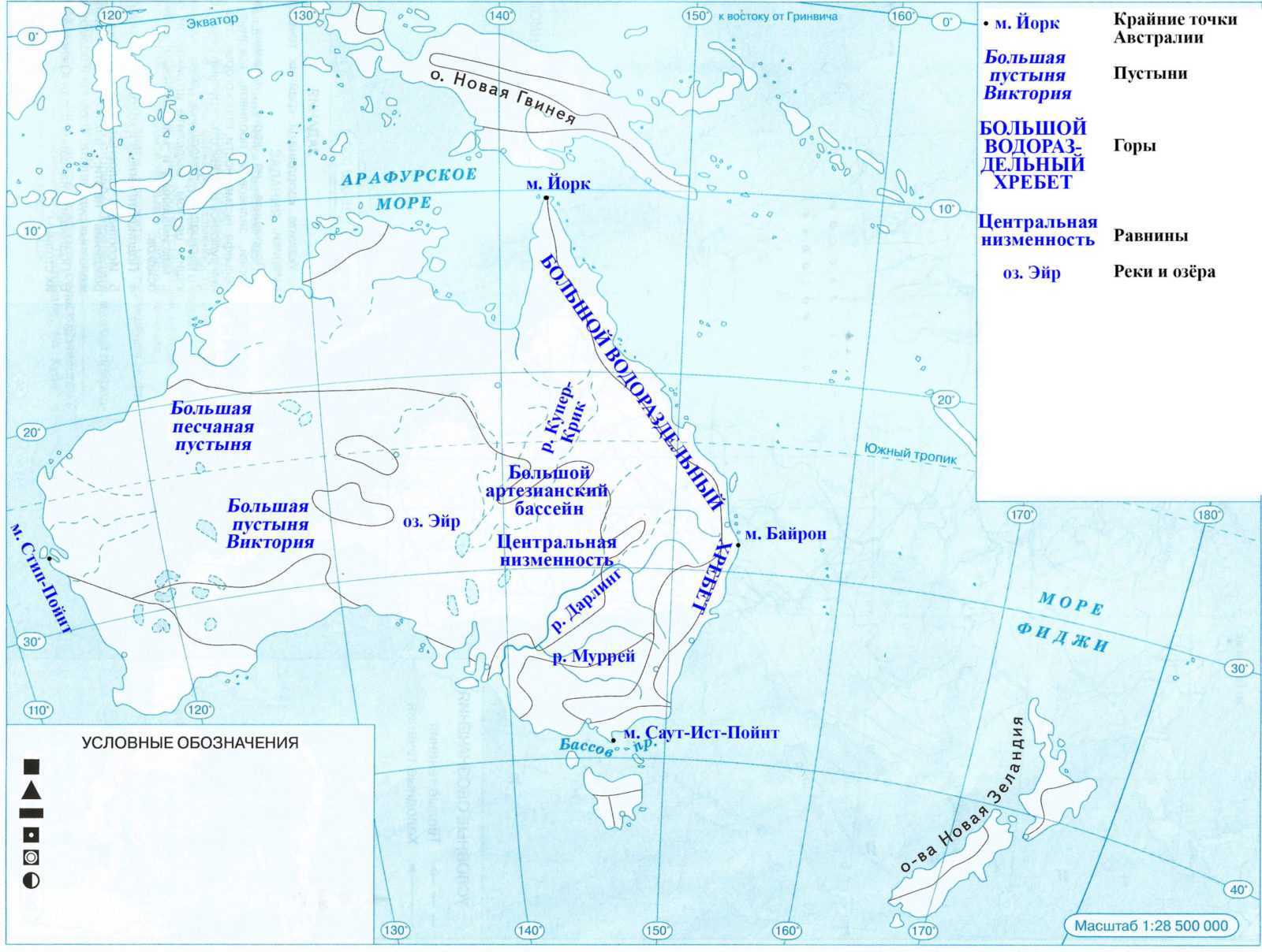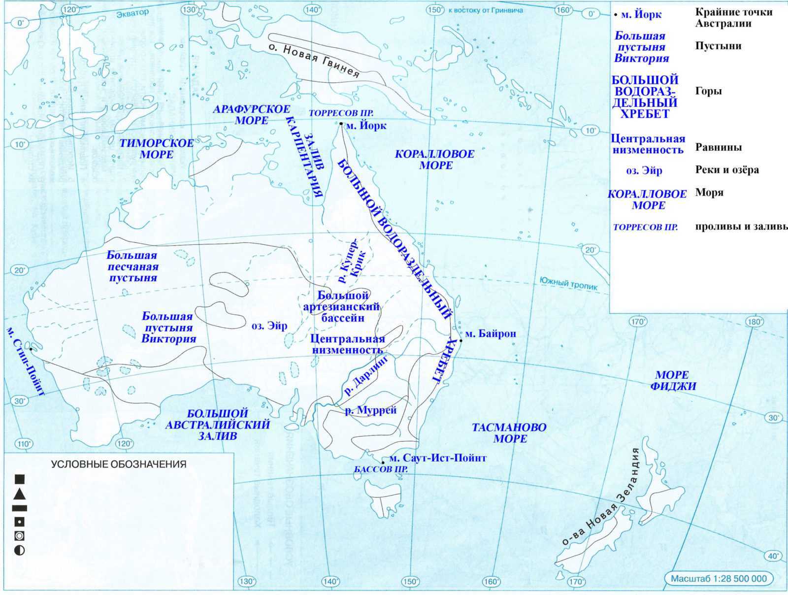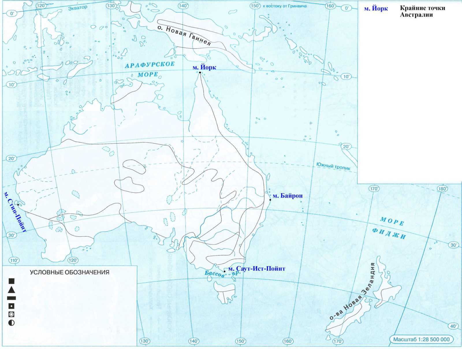 1. Подпишите на карте крайние точки Австралии и их географические координаты.