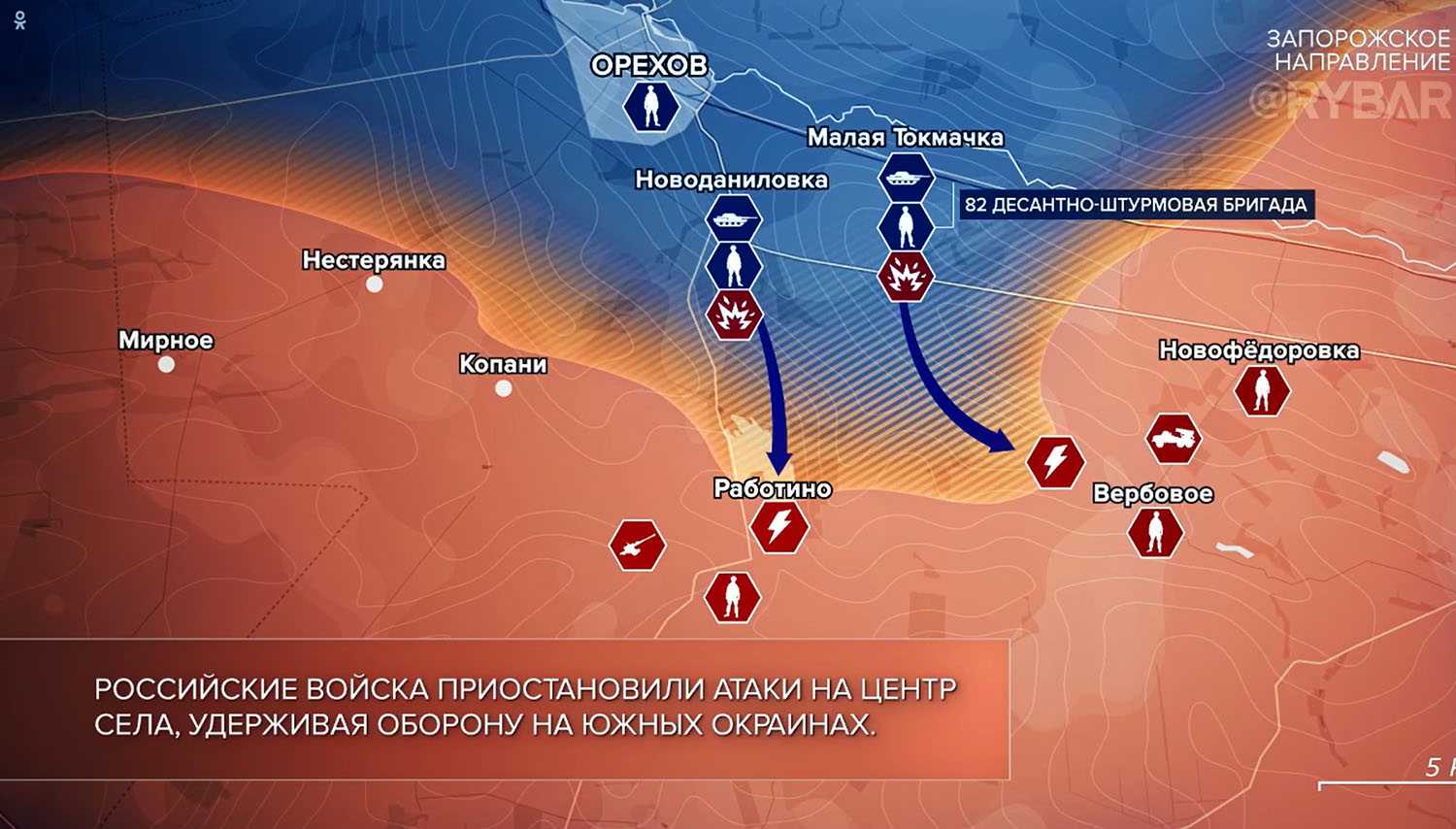 На Запорожском фронте идут бои на рубеже Работино-Вербовое, у Вербового фиксируется 80-я отдельная десантно-штурмовая бригада ВСУ (ппд – г. Львов). Работино – в серой зоне, ВСУ негде закрепляться под огнем РСЗО и фугасными авиабомбами. Идут тяжелые бои.