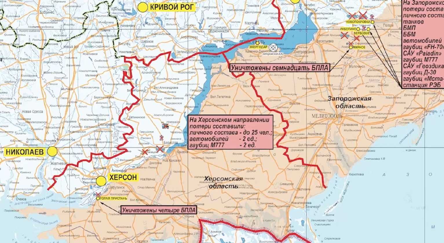 Потери противника составили до 55-ти украинских военнослужащих, два автомобиля, три артиллерийские системы М777 производства США и самоходная артиллерийская установка «Гвоздика».