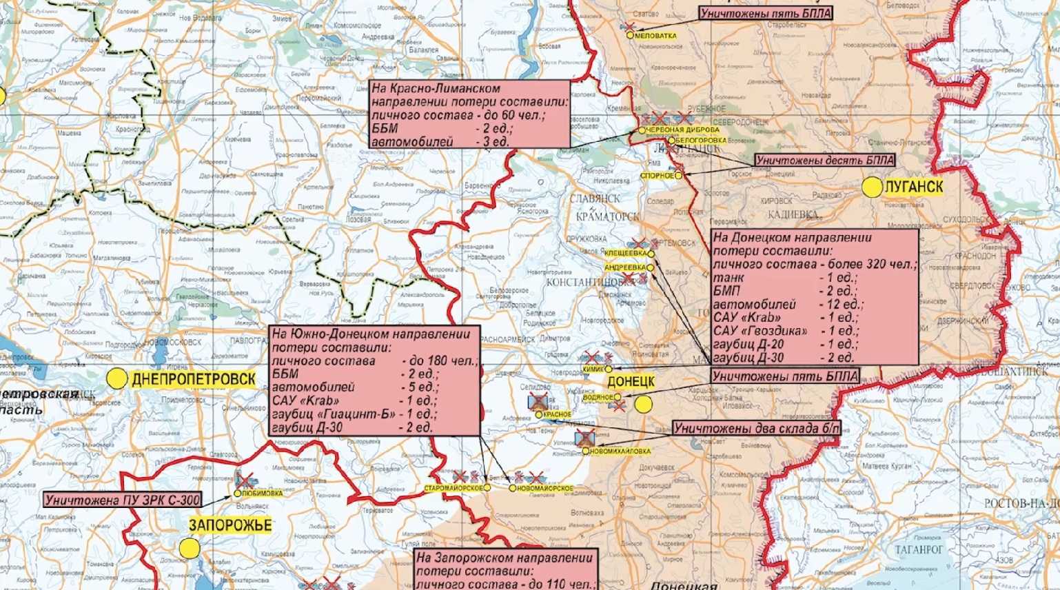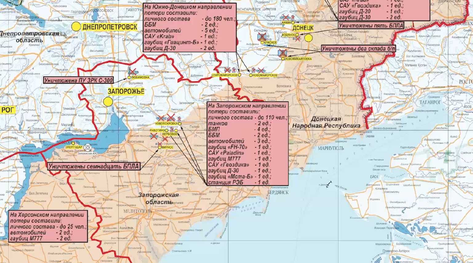 Уничтожено до 110-ти украинских военнослужащих, два танка, четыре боевые машины пехоты, две боевые бронированные машины, три автомобиля, самоходная артиллерийская установка М109 «Paladin» и артиллерийская система М777 производства США, самоходная артиллерийская установка «Гвоздика», гаубицы: FH-70 производства Великобритании, «Мста-Б» и Д-30, а также станция радиоэлектронной борьбы по обнаружению БПЛА и блокированию их каналов управления и навигации «Буковель-AD».