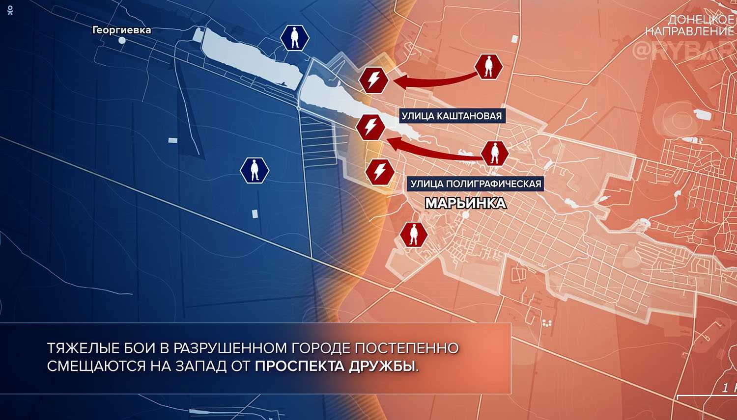 На Донецком направлении российские войска смогли существенно расширить зону контроля в Марьинке. Тяжёлые бои в разрушенном городе постепенно смещаются на запад от проспекта Дружбы.