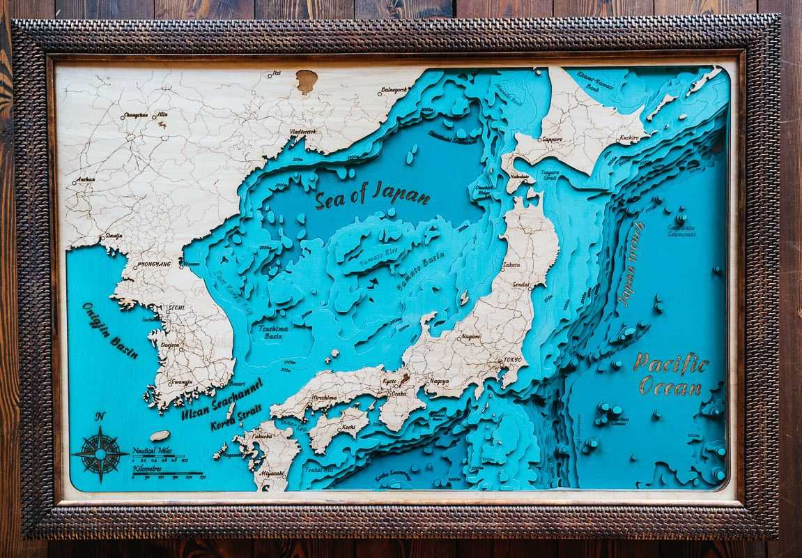Япония на карте мира расположилась на северо-западе Тихого океана. Общая протяженность береговой линии островного государства – 19,2 тыс. км. На востоке берега Японии омывает Тихий океан, на западе – Японское море, отделяющее ее от Северной и Южной Кореи и России, на юго-востоке – Восточно-Китайское море, по которому проходит граница с Китаем и Тайванем, и на севере – Охотское море, где Страна восходящего солнца граничит с Россией.
