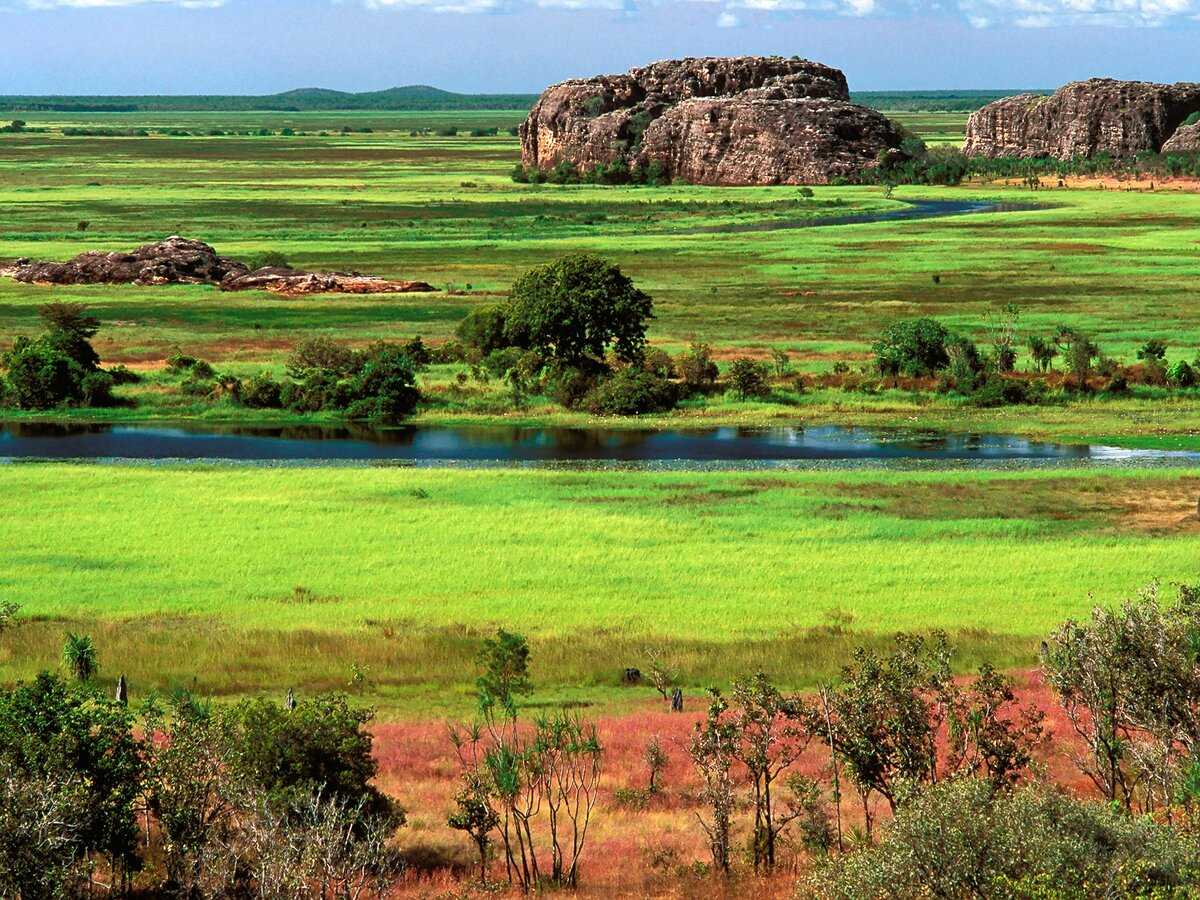 Также встречаются и скалистые плато с высокими горами, достигающими высоты около трех тысяч метров над океаном. Австралия является обширным плато, края которого приподняты, а центральная территория является вогнутой. В этом месте располагается самое большое материковое озеро Эйр. На востоке и юго-западе находятся прибрежные горы, занимая лишь 5 процентов всей материковой площади. Вся остальная территория является равниной.