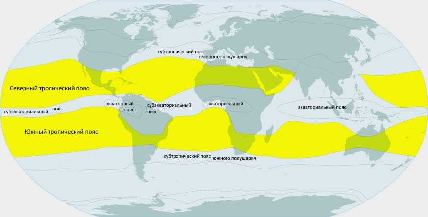 В Северном полушарии тропический климат распространяется к северу от экватора между переходными климатическими зонами – субэкваториальным и субтропическим поясами. Если говорить о географических широтах, то тропики ориентировочно располагаются от 5°÷10° до 30°÷40° северных широт. Южный тропический пояс – на юг от экватора, границы которого начинаются от 5°÷15° до 25°÷35° южных широт.