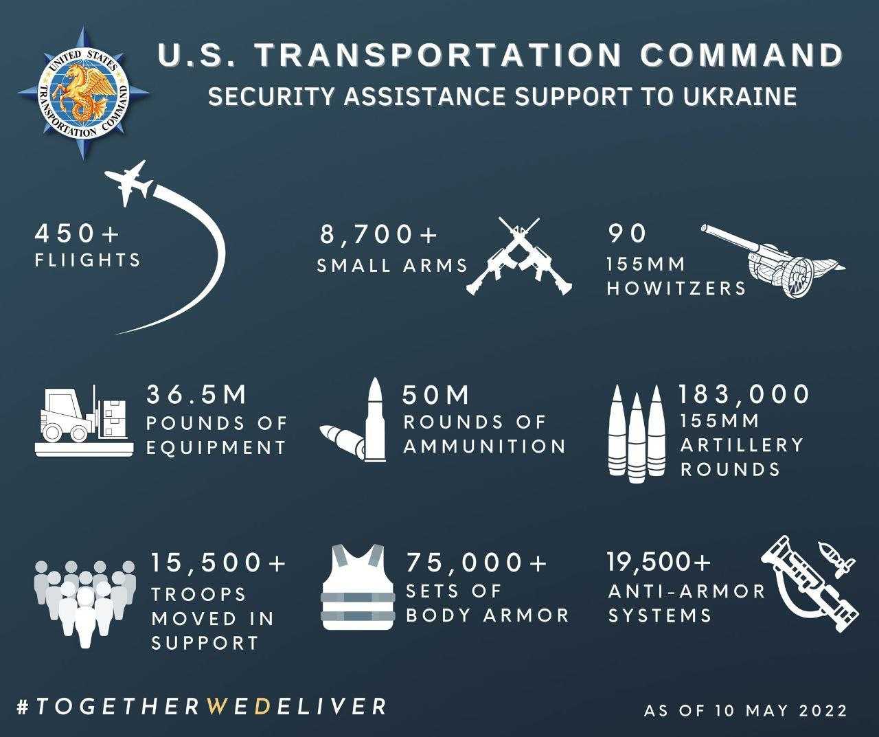 Инфографика Объединенного командования стратегических перебросок вооруженных сил США (U.S. Transportaion Command, USTRANSCOM) об объемах поставленного вооружения на Украину по состоянию на 10 мая 2022 года.