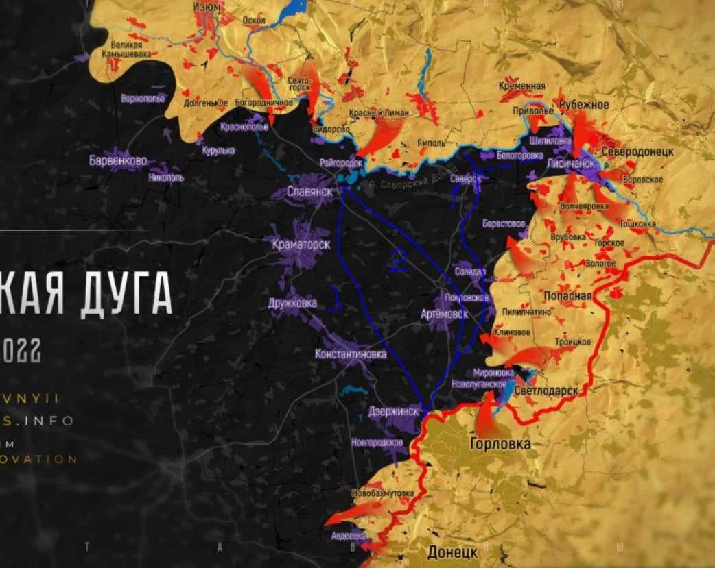 - Изюм. Продолжаются бои в районе Камышевахи, Курульки и Долгенького. Противник продолжает попытки напрячь фланг нашей группировки к северо-западу от Изюма, форсируя Северский Донец. На Славянском направлении войска взяли Дробышево и взяли Красный Лиман в полукольцо. Также фронт приблизился к Святогорску. Противник в ближайшее время может отойти за Северский Донец, чтобы укрепить фронт к северу от Славянска. На этом направлении также отмечается переброска резервов ВСУ.