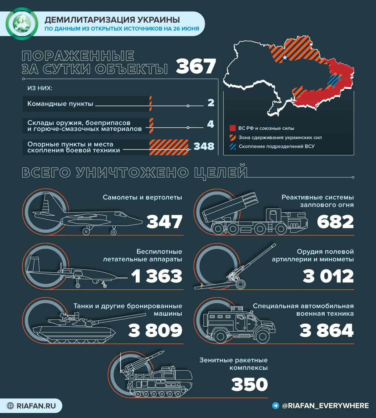 - Всего с начала проведения операции уничтожены 215 самолетов, 132 вертолета, 1 363 БПЛА, 350 зенитных ракетных комплексов, 3 809 танков и других боевых бронемашин, 682 боевые машины РСЗО, 3 012 орудий полевой артиллерии и минометов, а также 3 864 единицы специальной военной автотехники.