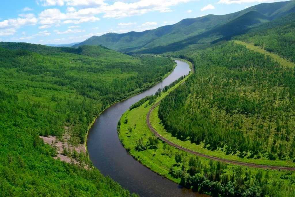 Амур начинается в месте объединения рек Аргунь и Шилка, на высоте 304 метра, затем впадает в Охотское море, направляясь с запада на восток, прямо с Манчжурских гор.